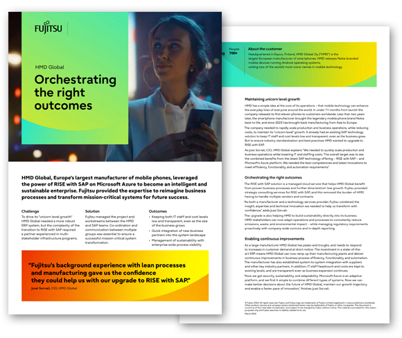 HMD Global, Europe’s largest manufacturer of mobile phones, leveraged the power of RISE with SAP on Microsoft Azure to become an intelligent and sustainable enterprise. Fujitsu provided the expertise to reimagine business processes and transform mission-critical systems for future success.