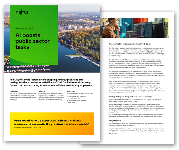 The City of Lahti team first familiarized themselves with the Microsoft 365 Copilot AI application in a Vision & Value workshop in spring 2024. In the three-part workshop, led by Fujitsu experts and funded by Microsoft, the Lahti employees recognized the potential of AI and identified possible use cases. In addition, the teams built a business case and developed a strategy for Copilot implementation.