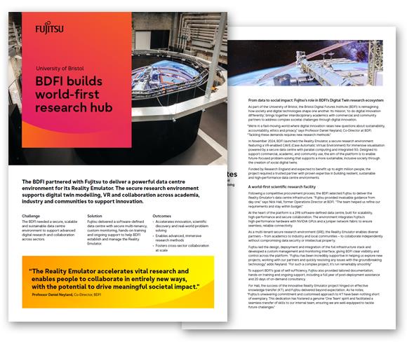 The Bristol Digital Futures Institute (BDFI) partnered with Fujitsu to deliver a powerful data centre environment for its Reality Emulator. The secure research environment supports digital twin modelling, VR and collaboration across academia, industry and communities to support innovation.