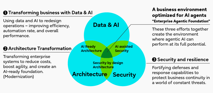 The first is “transforming business with data and AI.” It is essential to use technologies related to both data and AI to streamline, automate, and advance business environments. Simply inserting AI into existing processes will not deliver the desired results.